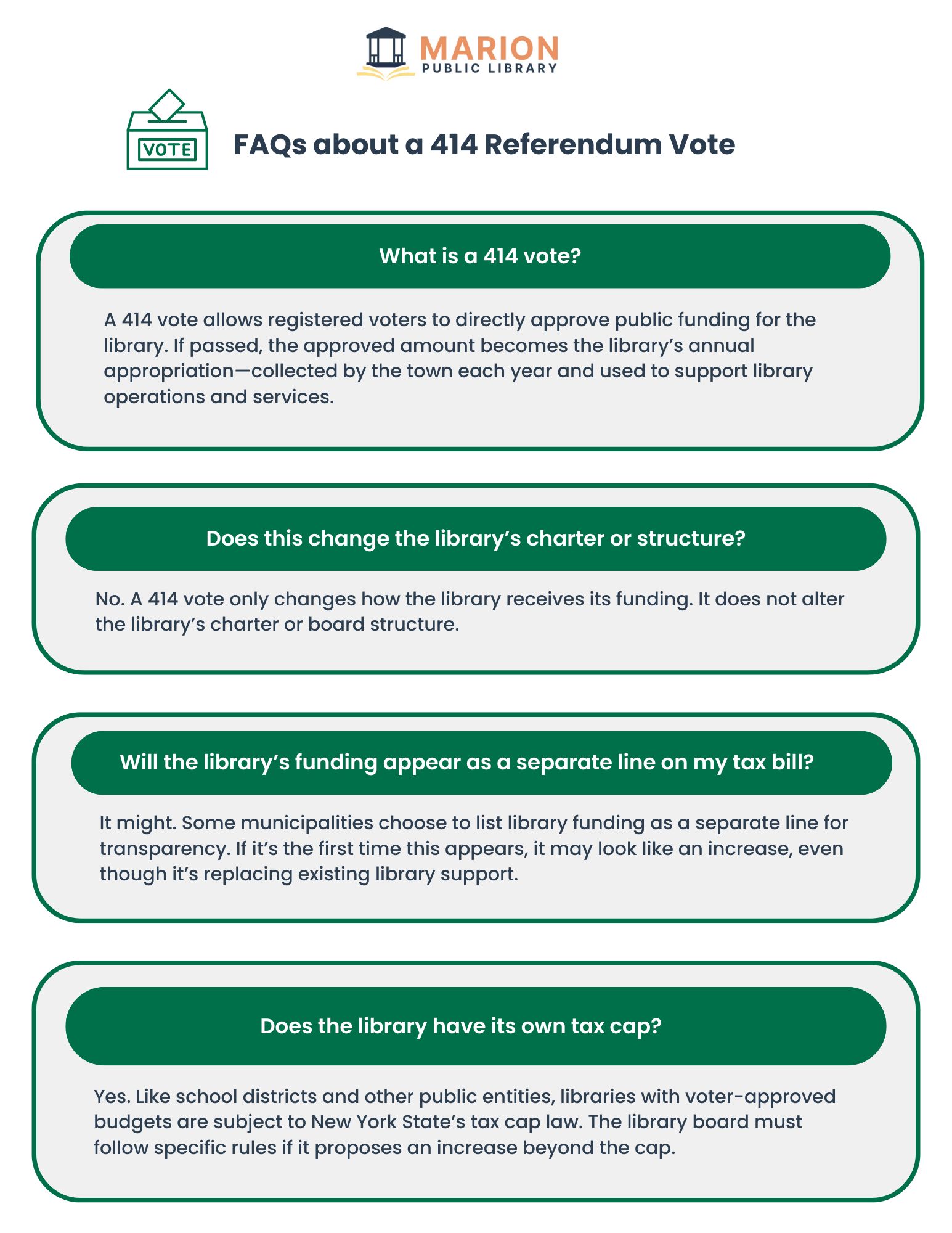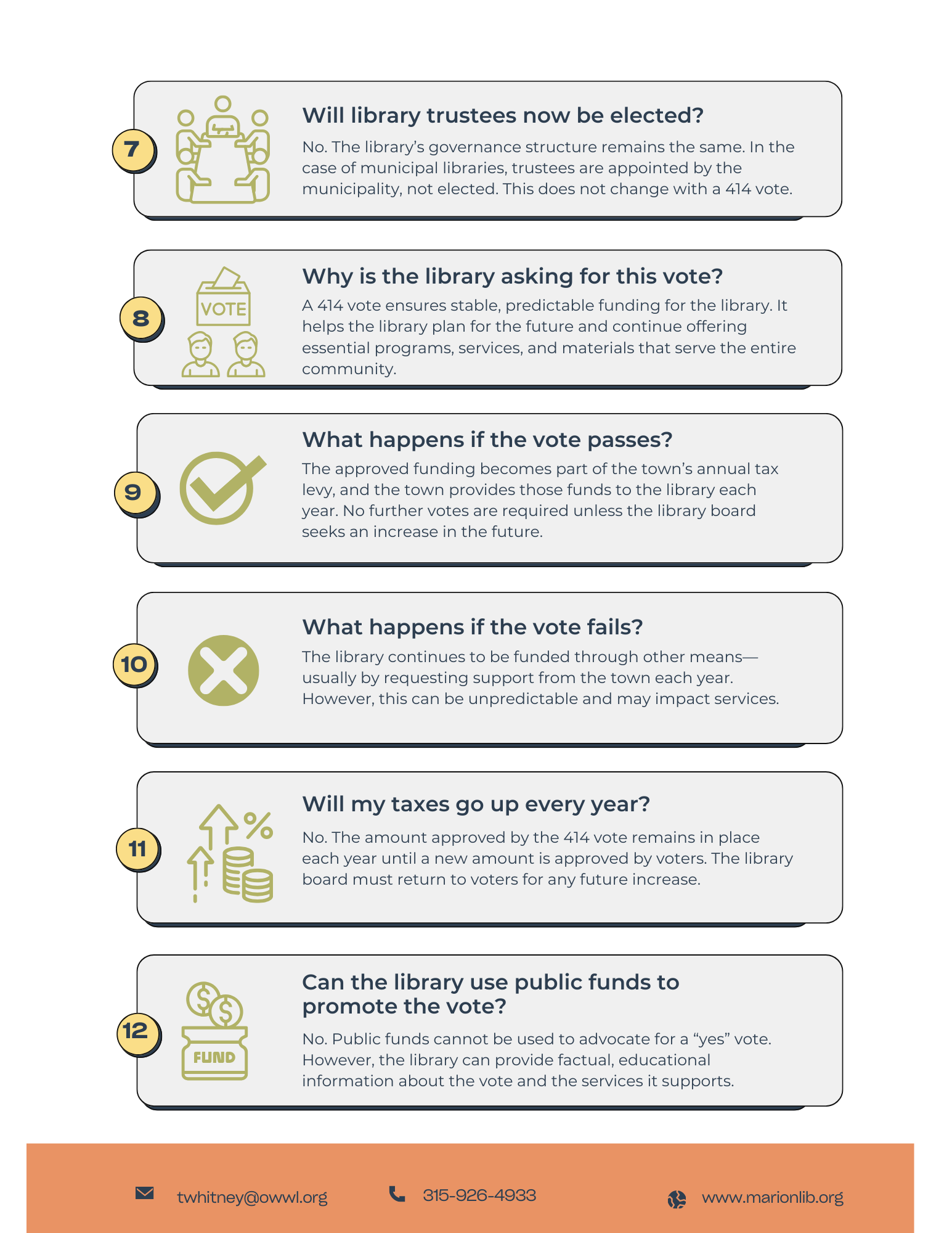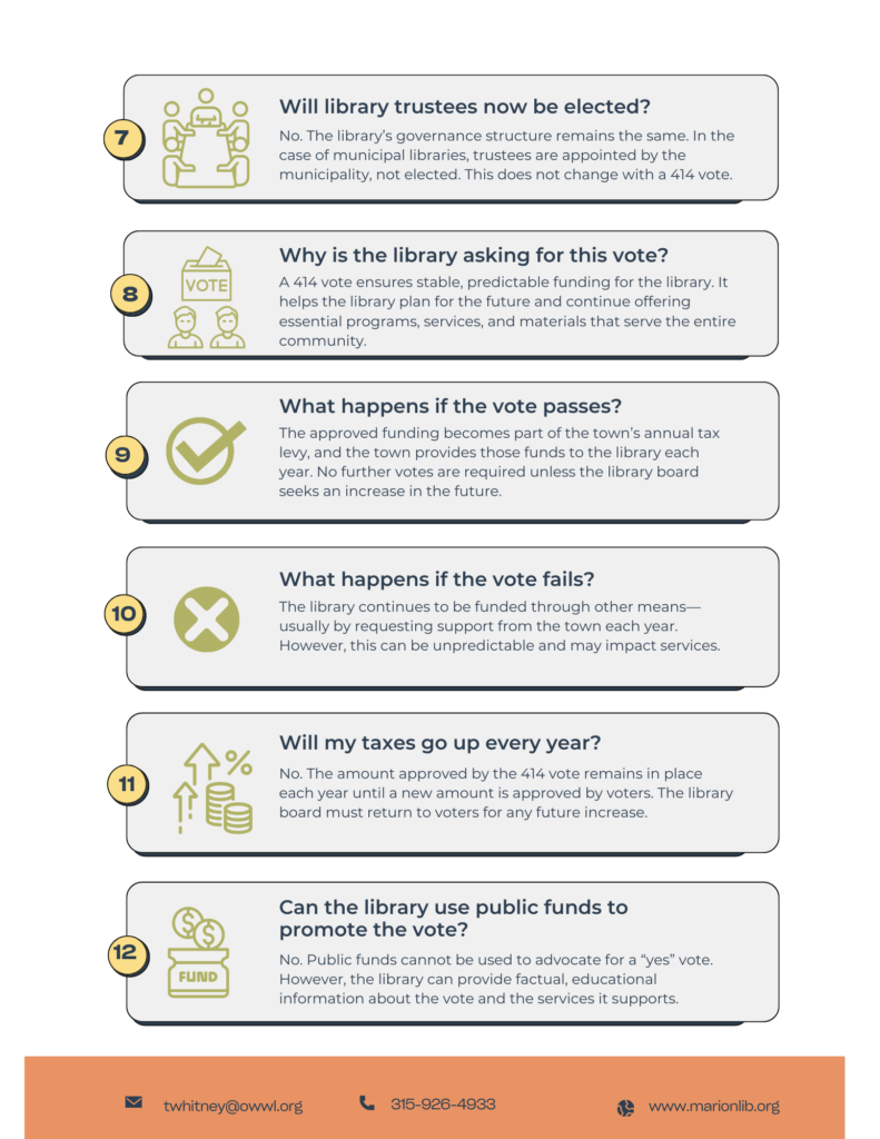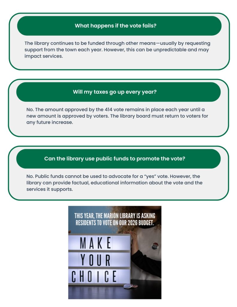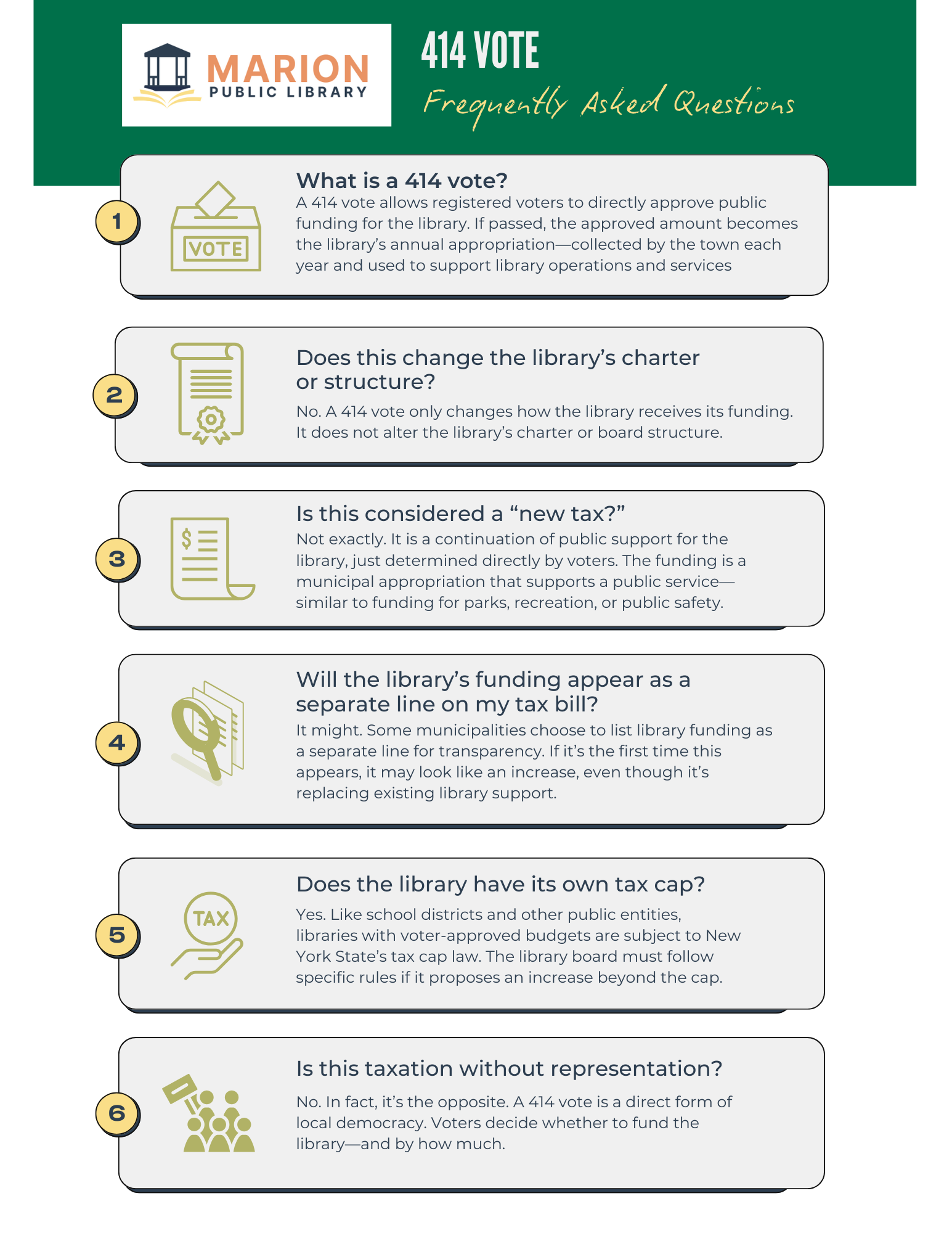 On behalf of the Marion Public Library, we extend our gratitude to the community for your support in the recent 414 referendum. Your vote reflects a shared belief in the importance of access to lifelong learning, literacy, and community resources.