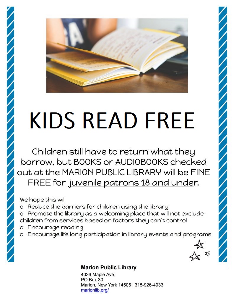 Administrative By LawsDownload Code of Ethics PolicyDownload Conflict of Interest PolicyDownload Fines and ChargesDownload Confidentiality of RecordsDownload Marion Library Planning Project Download Mision and Vision StatementsDownload FOIL Subject Matter ListDownload Freedom of Information Law Policy FOILDownload Open Meeting PolicyDownload Operations PolicyDownload Purpose and StructureDownload Reserve Fund PolicyDownload Circulation and Collections Borrowing PrivilegesDownload Local History PolicyDownload Material SelectionDownload Reconsideration of MaterialsDownload Youth Card PolicyDownload Public Space and Safety Bed Bug PolicyDownload Emergency Disaster PlanDownload No Smoking PolicyDownload Posting of Materials in the LibraryDownload Programming PolicyDownload Rules of ConductDownload Sexual Harassment PolicyDownload Tutor PolicyDownload Unattended Children PolicyDownload Vulnerable Adults PolicyDownload Whistleblower PolicyDownload Video SurvellianceDownload Volunteer PolicyDownload Technology Computer UseDownload Internet Use PolicyDownload